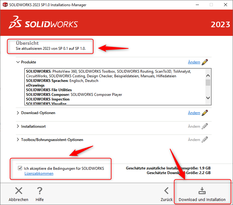 Lizenzabkommen akzeptieren und auf "Download und Installation" klicken.